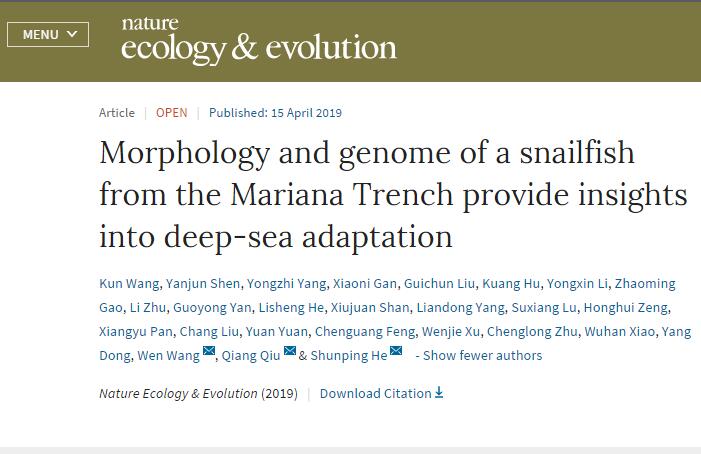 中國科學院深海科學與工程研究所和水生生物研究所與西北工業大學聯合攻關,對生活在馬里亞納海溝7000米以下的獅子魚開展了多方面的深入研究,在分類學上厘清了其系統地位,首次在形態上發現其適應深淵的變化,在多組學大數據分析的基礎上揭示了深淵適應的遺傳基礎。北京時間41523時許,該研究成果在線發表于英國自然雜志子刊Nature Ecology & Evolution(自然-生態與進化),題為《Morphology and genome of a snailfish from the Mariana Trench provide insights into deep-sea adaptation》。深海所為第一作者單位和第一通訊作者單位。