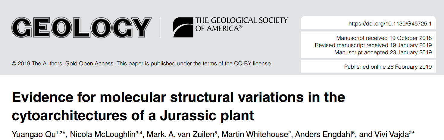 近期地外海洋系統(tǒng)研究團隊屈原皋副研究員在地學(xué)領(lǐng)域頂級期刊《Geology》上發(fā)表學(xué)術(shù)論文。該論文以侏羅紀(jì)蕨類植物化石為例,與現(xiàn)代同類蕨類植物對比,運用拉曼光譜、傅里葉紅外光譜和二次離子質(zhì)譜方法研究侏羅紀(jì)蕨類植物細胞結(jié)構(gòu)中的礦物、元素、同位素、有機分子結(jié)構(gòu)、光能團等特征,深入分析細胞分裂周期及埋藏之后經(jīng)過地質(zhì)歷史時期的變化。