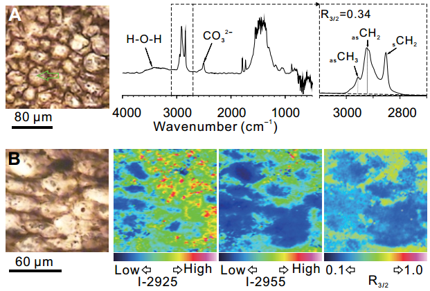 紅外光譜圖顯示蕨類化石細胞微尺度有機分子官能團差異