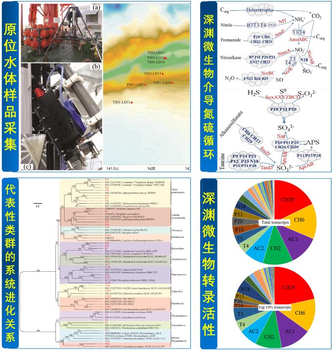 基于新的基因組分析技術(shù),研究人員成功獲取了30個深淵微生物類群的高質(zhì)量基因組序列,闡明了與氮硫相關(guān)的元素循環(huán)過程和轉(zhuǎn)錄活性特征,并重點闡釋了ChloroflexiMarinimicrobia分別在深淵難降解型有機物和蛋白類有機物的代謝方面所發(fā)揮的重要作用。