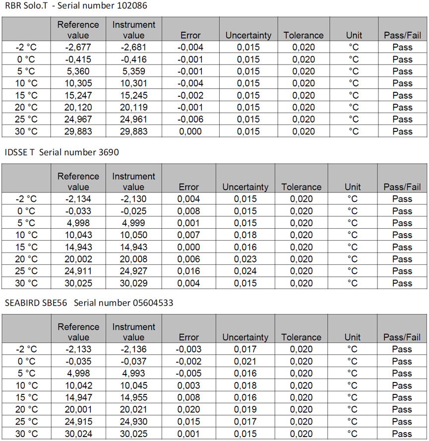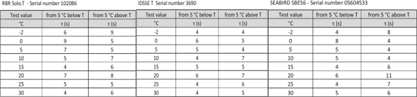 自2018年6月開(kāi)始,Trescal機(jī)構(gòu)選取了海鳥(niǎo)(SBE 56)、RBR (Solo.T)、NKE(S2T)、NKE(WiSens)等國(guó)際上知名海洋傳感器制造商供應(yīng)的同類溫度傳感器,進(jìn)行比測(cè)試驗(yàn),在長(zhǎng)達(dá)24周的測(cè)試期內(nèi),分別完成了測(cè)量精度、響應(yīng)時(shí)間等一系列性能測(cè)試。測(cè)試結(jié)果顯示:RBR Solo.T、IDSSE T和SBE 56的測(cè)量誤差均不超過(guò)±0.020℃,其中RBR Solo.T的最大誤差為-0.006℃,IDSSE T的最大誤差為0.016℃,SBE 56的最大誤差為0.020℃;在響應(yīng)時(shí)間測(cè)試中,RBR Solo.T、IDSSE T和SBE 56的系統(tǒng)整機(jī)響應(yīng)時(shí)間均維持在11s以內(nèi),測(cè)試結(jié)果比對(duì)圖如下: