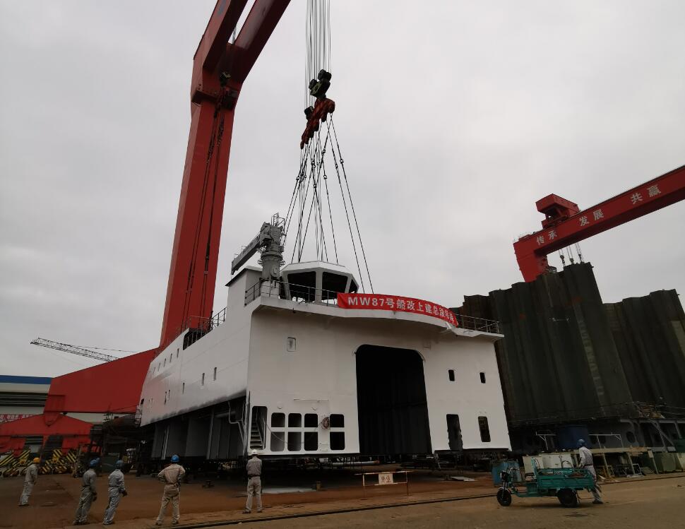 10月10日上午,福建馬尾船廠,萬米載人潛水器支持保障母船MW87號(暫定名)順利完成上建總段吊裝,這標志著該船主體結構建造完成、科考設備及其科學與工程實驗室等改造布局已確定,是船舶建造改造的關鍵節點之一。