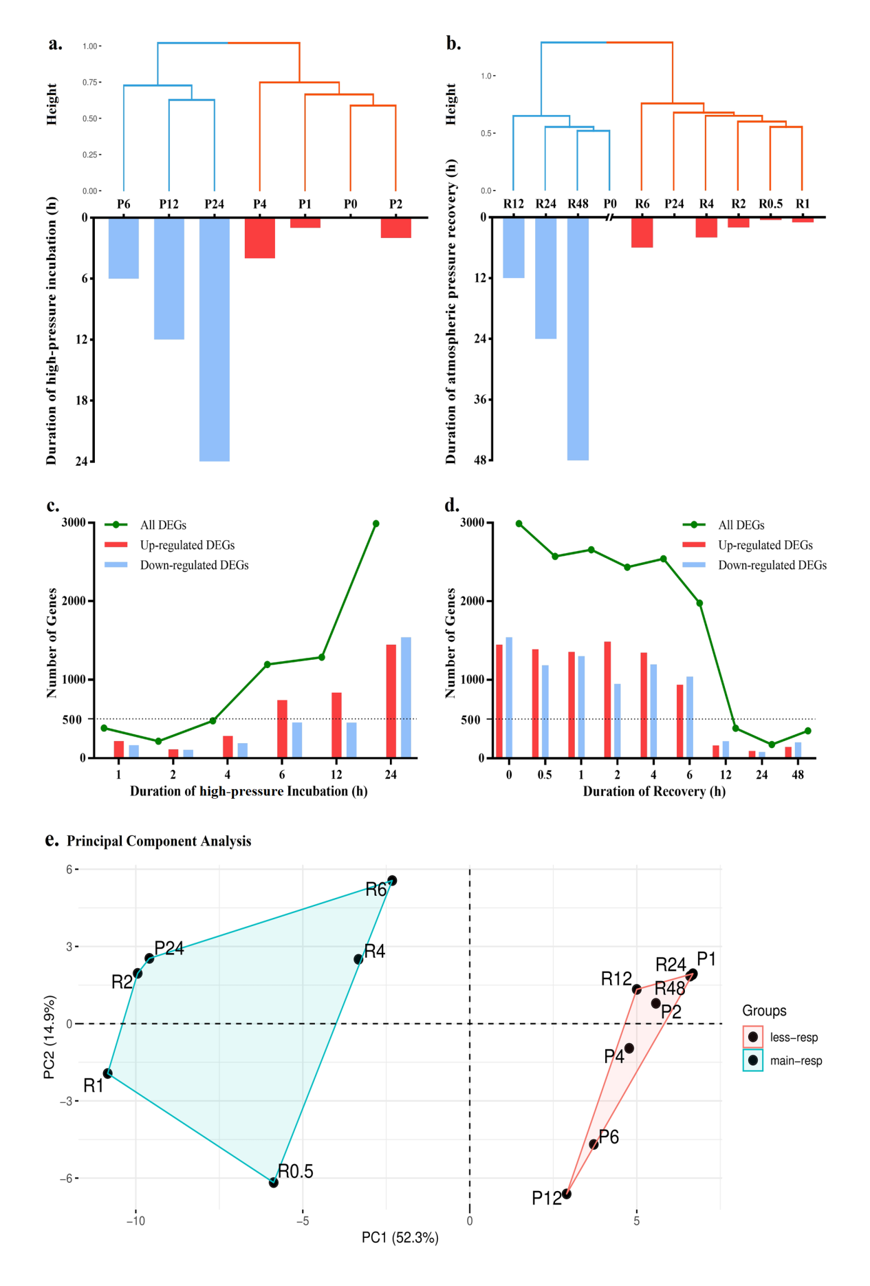 研究發現,參與基因信息傳遞的bZIP轉錄因子是對壓力變化最敏感的基因家族,在高壓培養2–4小時后開始顯著高表達。接下來產生響應的生物學過程是泛素化和細胞內吞,與這兩個生物學過程相關的基因家族分別在高壓培養4小時和6小時后開始顯著高表達。