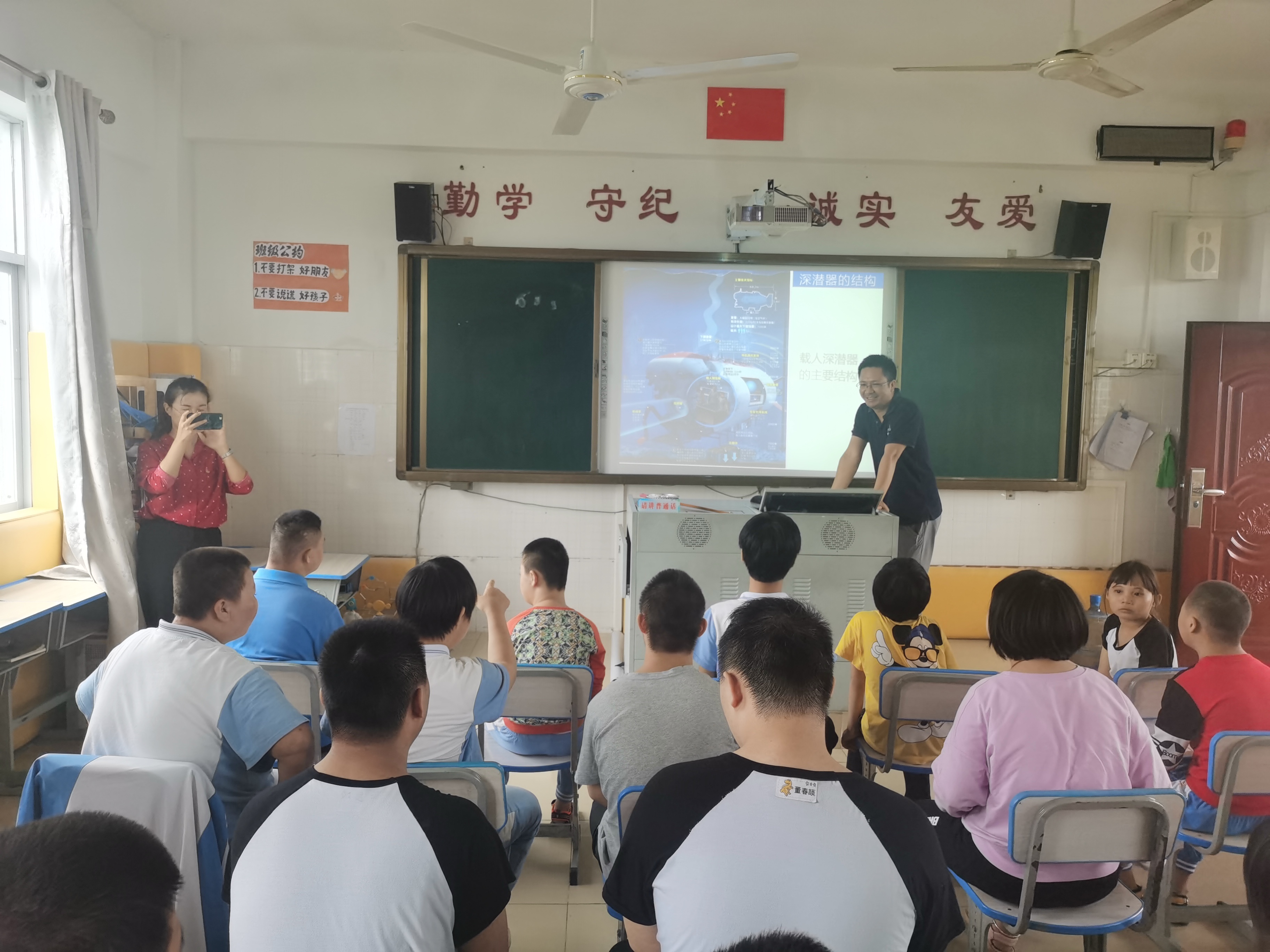 支部黨員首先在學校負責人的帶領下,參觀教室、宿舍、食堂及手工作品展覽室等,認真傾聽學校辦學情況,詳細了解學生的學習和生活情況。并為孩子們送上了雨衣、海洋仿真玩具模型、籃球等生活、學習和體育用品。隨后,支部書記陳順為孩子們呈現了一堂生動有趣的海洋科普講座,并播放了海洋科考的視頻,帶領他們一起探索海底世界的奧秘,叩開認知海洋世界的大門。孩子們熱情高漲,認真聽講,表現出了濃厚的興趣和熱情。科普結束后,支部黨員與孩子們積極互動和交流,孩子們還自豪地拿出自己的繪畫作品向大家展示,用他們自己的方式表達對生活的熱愛和感恩。活動的最后,支部黨員與特殊教育學校的老師就如何更加深入地為孩子們提供力所能及的幫助等問題進行了交流。