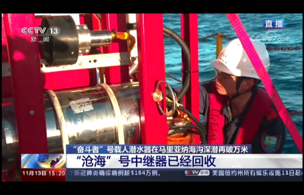 全海深視頻直播系統中的“滄海”號視頻著陸器開展了6次萬米試驗,其中“滄海”號與“奮斗者”號在萬米海底開展了三次聯合作業;全海深視頻直播系統建立了“奮斗者”號載人潛水器→“滄海”號視頻著陸器→“探索二號”船水面控制中心→衛星→中央廣播電視總臺演播室的實時通信鏈路。實現把“奮斗者”號在萬米海底進行科考作業的過程向全國人民進行了世界上首次萬米海底的超高清視頻實況直播和科普教育;通過“滄海”號和“奮斗者”號載人潛水器上的通信對接,使北京中央廣播電視總臺演播室和萬米海底的潛航員、科學家開展實時視頻對話。海試驗證了項目組研制的全海深超高清相機、超高清3D相機、照明系統、中繼器和“滄海”號著陸器、水密接插件等全部國產裝備的可靠性。