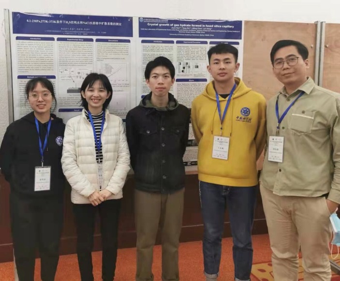 孫既粵和黃盈盈分別作了題為“Crystal Growth of Gas Hydrate Formed in Fused Silica Capillary(作者:孫既粵、辛洋、周義明、蔣磊)、“0.1-2 MPa, 273K-373K 條件下 H2S 在純水和 NaCl 水溶液中擴散系數的測定”(作者:黃盈盈、蔣磊、周義明、陳穎)的墻報展示。此次會議,鍛煉了年輕科研人員的學術交流能力,增進了同行間的了解與合作,受到了參會專家的一致好評。