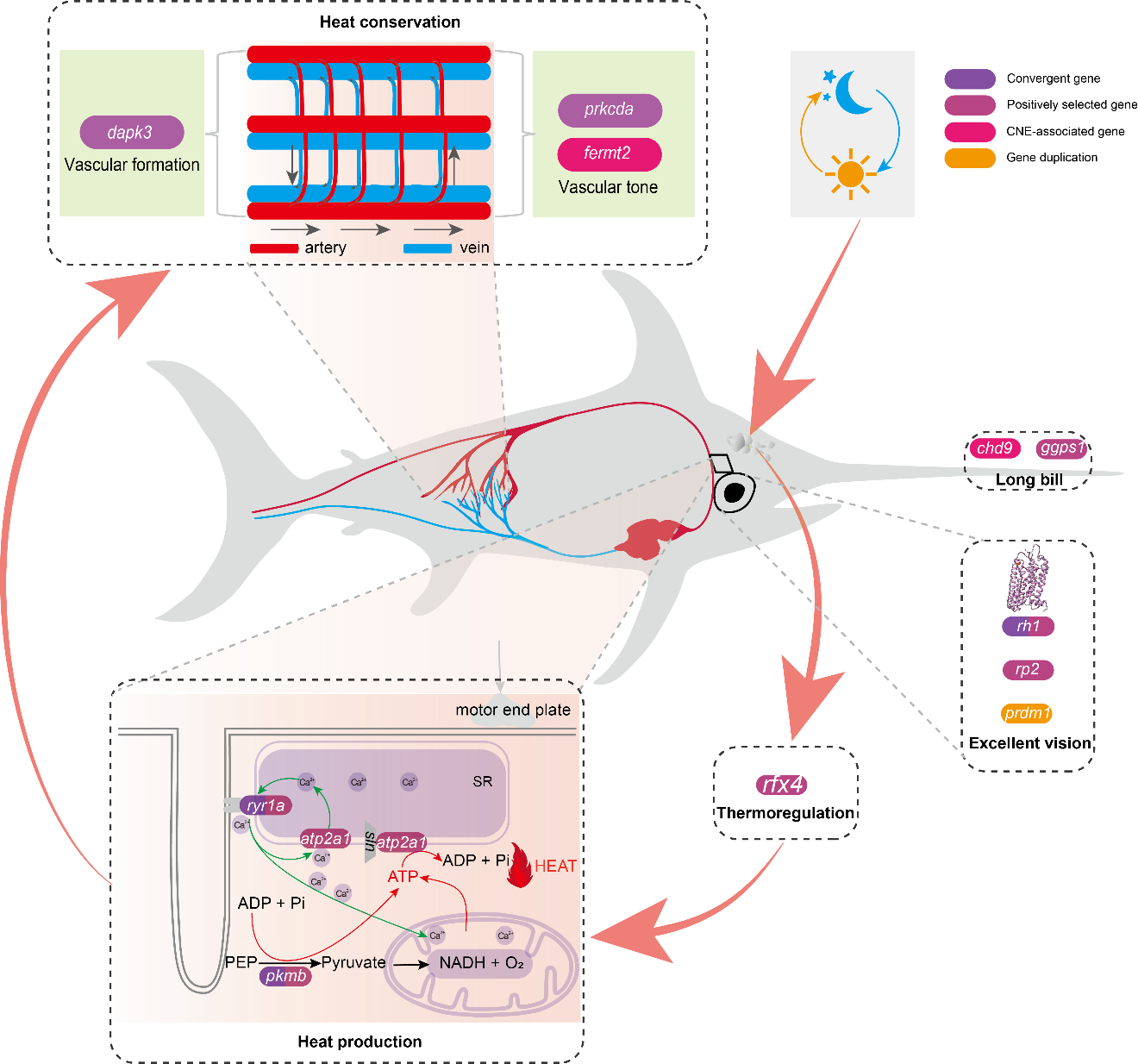 為了應對水體快速散熱的特點,水生恒溫動物通常具有一個獨特的逆流交換器,用于溫度的保存和傳遞。劍魚和旗魚中存在著由動脈和靜脈血管平行排列,血流方向完全相反的血管網絡系統。在對劍魚和旗魚的同源基因分析中,發現存在著9個顯著受到了正選擇的基因,其中有三個基因 (dapk3, prkcdarfx4) 的存在較大的氨基酸改變。其中dapk3是脊椎動物動物平滑肌收縮調控的重要因子,該基因可能參與了血管網絡的形成;prkcda是調控血管張力的重要基因,該基因可能促進了逆流交換器更好的實現熱量的保存和傳遞。而Rfx4高表達于哺乳動物視交叉上核,對晝夜變化和溫度刺激具有調控作用。劍魚和旗魚中該基因的顯著改變表明視交叉上核可能對它們也具有關鍵的調節作用。