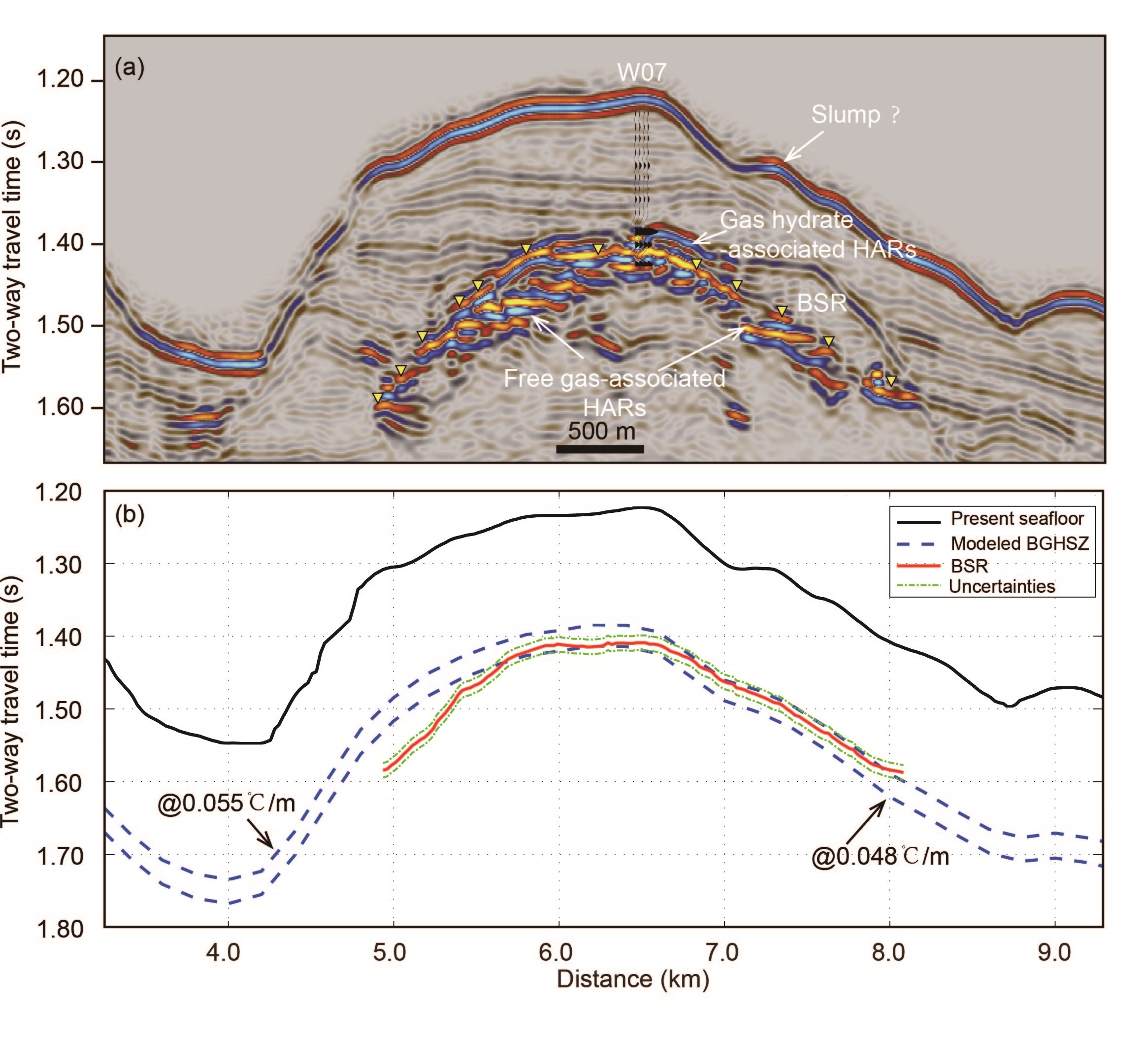 圖1 a)高分辨地震剖面指示天然氣水合物及游離氣分布特征 b) 地震剖面上解釋的BSR分布與理論計算的水合物穩定帶底的對比