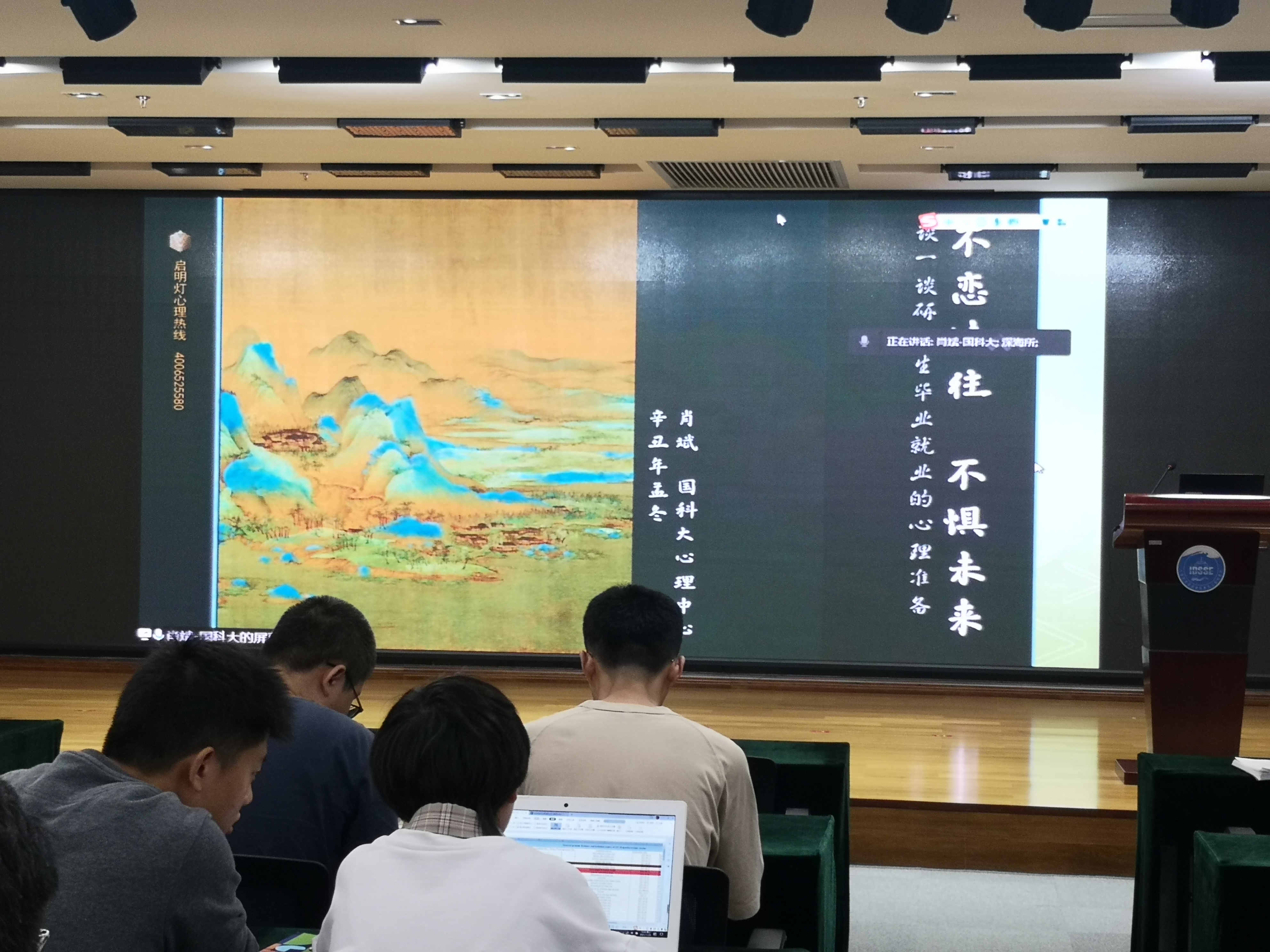 肖斌在講座中為大家分析了研究生畢業(yè)就業(yè)時常見的焦慮原因,例如信息網(wǎng)絡(luò)的全覆蓋、學(xué)生與社會的脫節(jié)、就業(yè)的艱難選擇、與曾經(jīng)的同學(xué)格格不入、理想與現(xiàn)實的落差等,幫助我們從古代詩詞與中華文化中尋求解決之道,包括全方位認(rèn)識自己、學(xué)會換角度看待問題、學(xué)會脫離舒適區(qū)、以平常心看待失敗與遺憾等。肖斌的講座是潤物細無聲的引導(dǎo)啟發(fā),為同學(xué)們的畢業(yè)就業(yè)做了一次極好的心理建設(shè)。