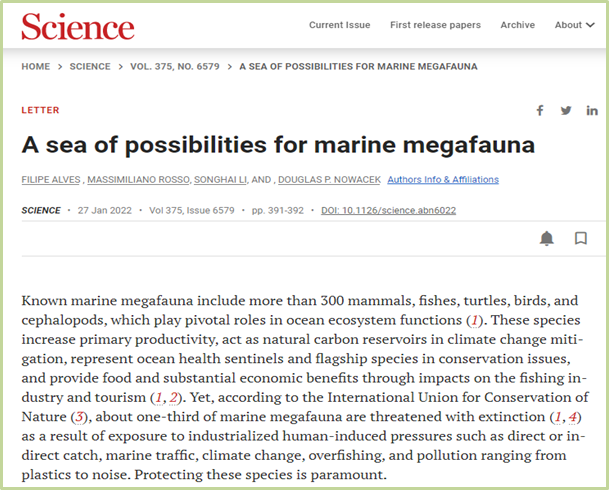 2022年1月27日,來自中國(guó)科學(xué)院深??茖W(xué)與工程研究所、美國(guó)杜克大學(xué)海洋實(shí)驗(yàn)室、葡萄牙海洋與環(huán)境科學(xué)中心(MARE)以及意大利國(guó)際環(huán)境監(jiān)測(cè)中心(CIMA)等多家國(guó)內(nèi)外科研機(jī)構(gòu)的科學(xué)家,聯(lián)名在期刊Science發(fā)表了題為“A sea of possibilities for marine megafauna”的Letter文章,旨在共同呼吁加強(qiáng)對(duì)海洋大型動(dòng)物的研究和保護(hù)工作。