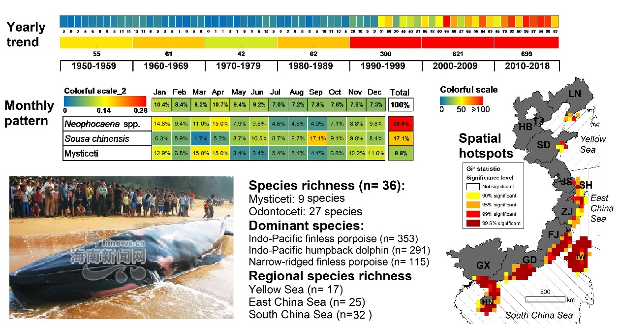 2022年2月4日,中科院深海所海洋哺乳動物研究團隊在國際期刊Science of The Total Environment在線發表了題為“Species diversity and spatiotemporal patterns based on cetacean stranding records in China, 1950–2018” 的論文。科研人員通過分析我國沿海近70年的鯨類擱淺數據,較為全面地揭示了我國鯨類的物種多樣性、相對豐度以及時空分布模式等重要信息。