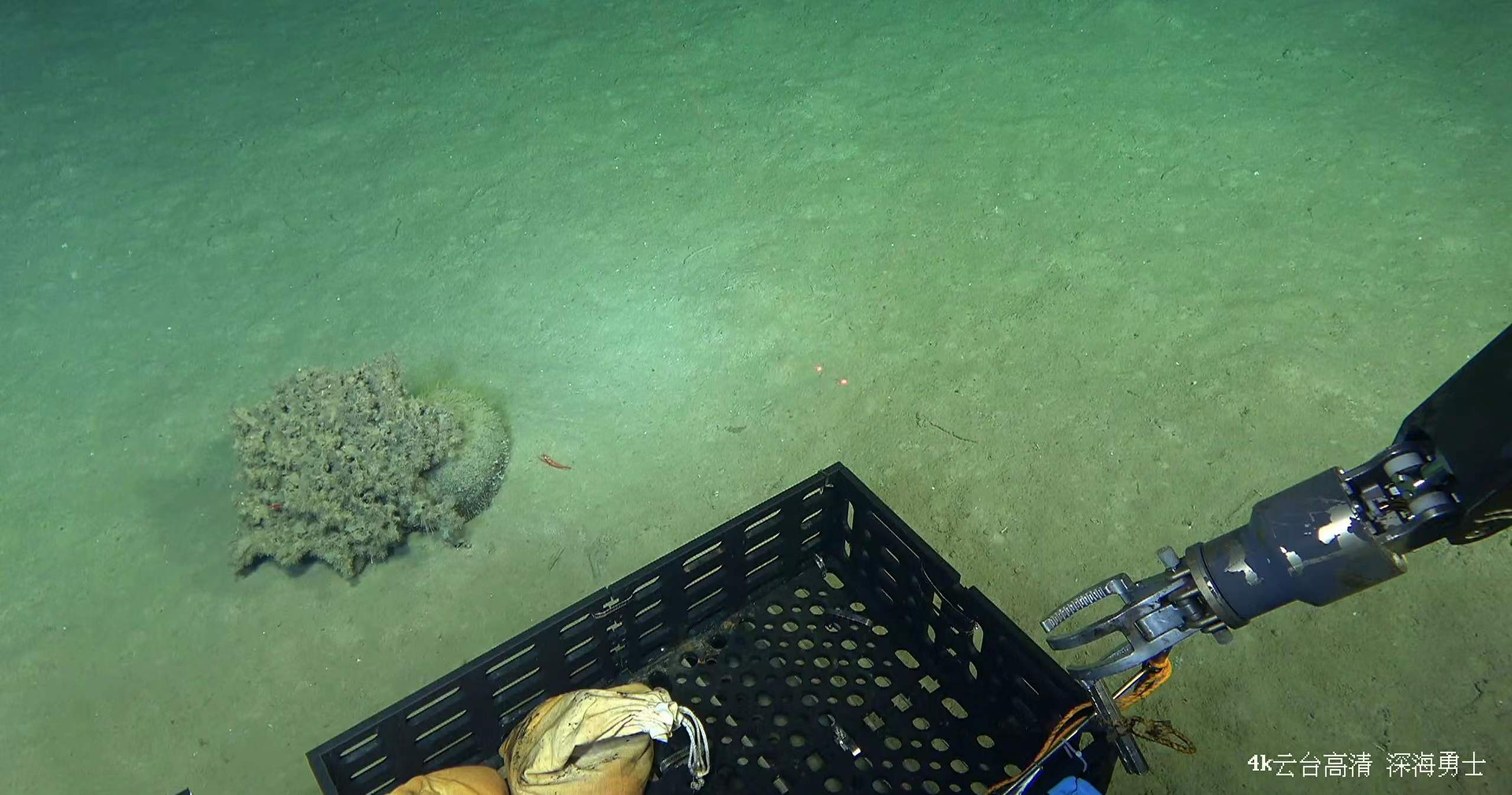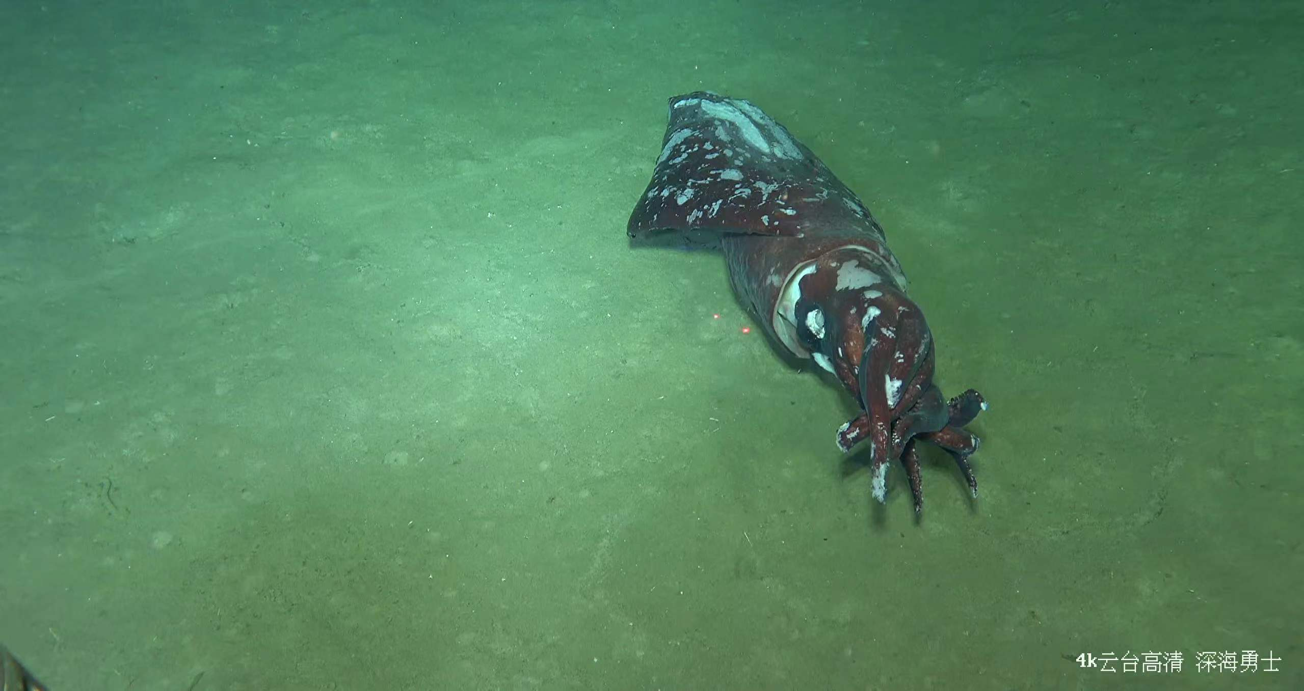 在2357米深度發(fā)現(xiàn)長(zhǎng)約1.6米的完整魷魚(yú)尸骸,圖中2個(gè)紅色光點(diǎn)間距離為10cm。