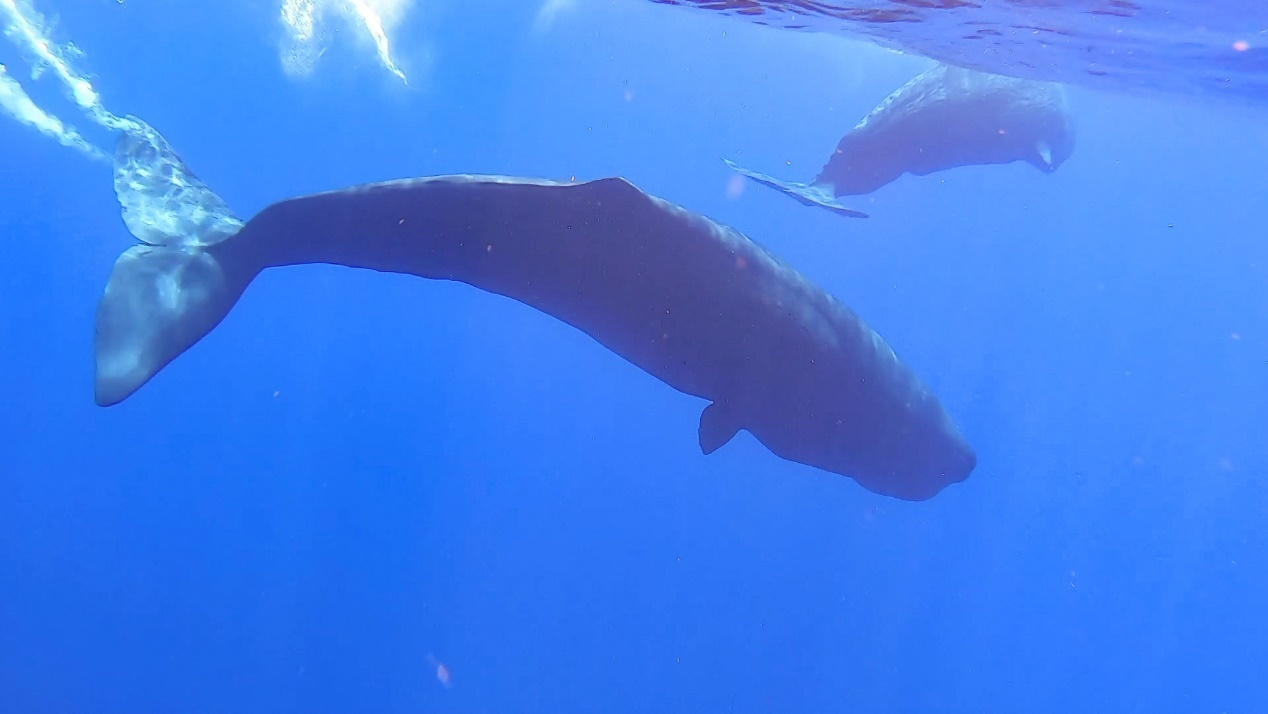 值得一提的是,科考隊員們曾多次觀察到抹香鯨和其它鯨類(弗氏海豚)混游的奇特現象。在蔚藍的海面上,幾頭海洋巨獸抹香鯨(體長十幾米,體重幾十噸)被數十頭小迷弟弗氏海豚(2至3米長,體重僅幾百公斤)所環繞追隨,抹香鯨高達數米的噴氣柱與弗氏海豚快速游動激起的浪花形成強烈的視覺反差。這種奇妙的場景立馬引發了科考隊員的熱烈討論,有人認為“蹭吃假說”可以解釋這種現象,因為弗氏海豚跟著抹香鯨有可能不勞而獲,撿吃漏網之魚,畢竟抹香鯨食量驚人,飽餐之后所剩殘羹也夠一群海豚大快朵頤。也有人認為這種混游現象是弗氏海豚的一種社會寄生、尋求庇護的行為,即弗氏海豚對抹香鯨有某種“小弟崇拜大哥”的依附感,通過追隨抹香鯨以獲得庇護、躲避天敵。接下來,科研人員將對相關科考數據進行分析,開展社會行為學研究,對解釋鯨豚混游現象的不同猜想進行驗證。