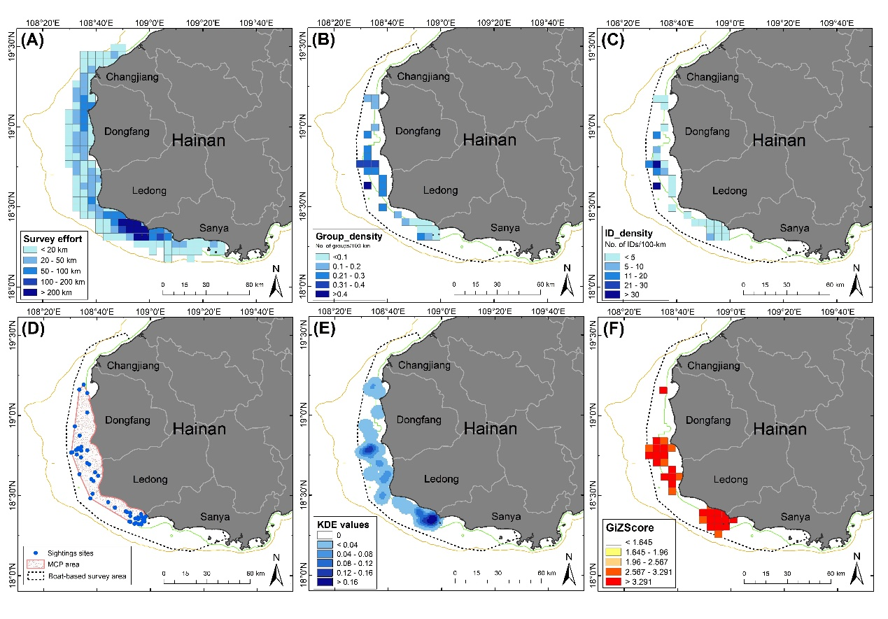 經過全世界范圍內的鯨類科研人員幾十年的不斷發展和完善,漁民問卷調查、船基目視調查和被動聲學監測都已逐漸成為非常重要的鯨類調查技術手段,而且被廣泛運用于各種類型的鯨類生態和保護研究項目。盡管如此,這些方法都有各自的使用條件、范圍、要求和局限性,這就導致單一方法所獲得的調查結果往往難以驗證其可靠程度。尤其應當注意的是,全球還有很多類似中國這樣的許多欠發達的國家/地區,其共性是鯨類本底資料通常十分匱乏。此外,由于研究和保育資金支持非常有限,欠發達國家/地區的鯨類科研人員和保護工作者難以直接開展有針對性、大范圍、長期、系統的野外實地調查和監測。深海所研究團隊首次將漁民問卷調查、船基目視調查和被動聲學監測這三種技術方法組合,以海南中華白海豚的發現、驗證和長期監測為示范,展示了中華白海豚在海南西南部的出沒分布及棲息地利用情況。相關的研究結果不僅為保護海南中華白海豚提供了基本的信息和資料,成為海南近海生態和珍稀動物保護的重要科學支撐,而且形成了一套循序漸進的、相互印證的、互相補充的整合式鯨類生態研究新范式,為全世界的鯨類科研人員提供了重要的示范參考,以便于在數據缺乏的水域更高效地開展鯨類生態和保護研究工作。