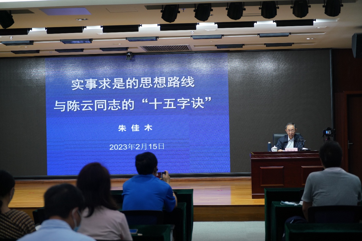 朱佳木教授在2個半小時的報告中,結合黨史國史和黨的文獻,以及他本人的親身經歷,分別從實事求是思想路線的意義,陳云同志的生平、思想與貢獻,陳云同志與實事求是思想路線的關系,陳云同志的“十五字訣”及其內涵,“十五字訣”是實現實事求是的必由之路,統一思想需要先把大家思想方法搞對頭等六個方面,深入淺出地講解了老一輩無產階級革命家陳云思想方法的精髓要義。