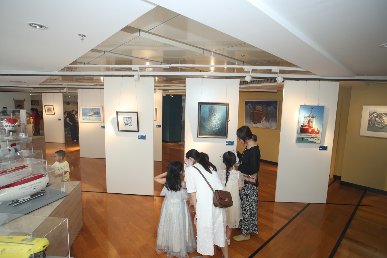而在深海空間的科學(xué)與藝術(shù)圖書館,“極地·深藍(lán)”藝術(shù)與海洋畫展備受歡迎,有別于其他活動場地,在這里,公眾可以放慢腳步,靜靜欣賞畫作的精美和想象力。