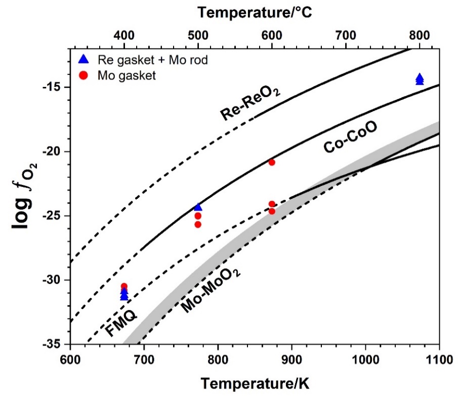 圖1. 不同溫度下,Mo-MoO2體系的HDAC實驗中氧逸度值與常用緩沖對的參考氧逸度值比較(紅:鉬片反應腔+水;藍:錸片反應腔+鉬絲+水;黑:不同氧逸度緩沖對在0.1 MPa,不同溫度下的參考氧逸度值,實線代表適用溫度范圍內的值,虛線代表外推的預測值)