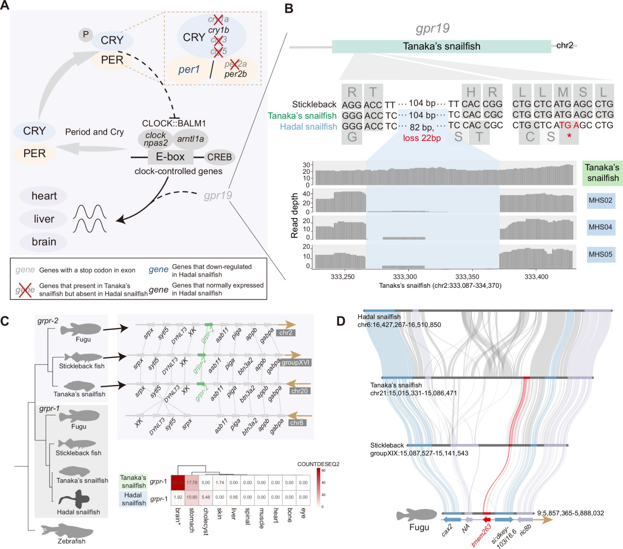 該研究還關(guān)注了深淵獅子魚在進(jìn)化過程中對黑暗的適應(yīng)。相較與細(xì)紋獅子魚,深淵獅子魚視覺系統(tǒng)中多個(gè)感光相關(guān)基因發(fā)生丟失,此外,感光元件的表達(dá)水平在不同深度上也發(fā)生了顯著變化,這表明其在深海環(huán)境中對視覺的需求相對較低。進(jìn)一步研究發(fā)現(xiàn),與節(jié)律相關(guān)的基因也發(fā)生丟失或假基因化,表明深淵獅子魚的生物鐘可能仍然存在,但不再基于光的調(diào)控。