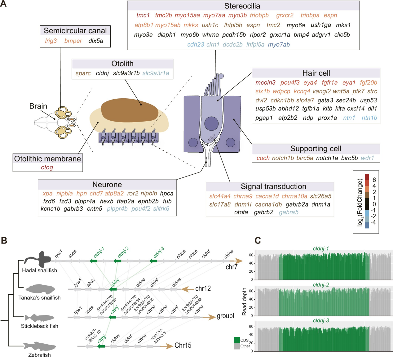 由于缺乏光線,聽覺似乎對深淵獅子魚的生存至關(guān)重要。研究發(fā)現(xiàn),聽覺相關(guān)基因cldnj在深淵獅子魚基因組中拷貝數(shù)增加,該基因是耳石形成所必需的基因。轉(zhuǎn)錄組數(shù)據(jù)也表明深淵獅子魚聽覺相關(guān)蛋白表達(dá)量顯著增加。