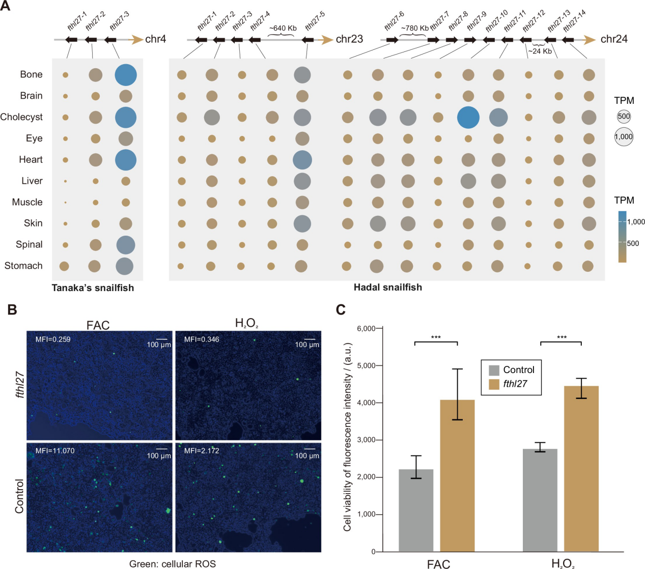 值得注意的是,轉(zhuǎn)鐵蛋白編碼基因fthl27在深淵獅子魚基因組中發(fā)生串聯(lián)重復(fù)(14個(gè)拷貝),進(jìn)一步的細(xì)胞實(shí)驗(yàn)證明,fthl27過表達(dá)細(xì)胞內(nèi)ROS水平顯著降低,并具有顯著更高的細(xì)胞活力。這增加了深淵獅子魚在高靜水壓力下對氧化應(yīng)激的耐受力,可能是其適應(yīng)高壓環(huán)境的重要因素之一。