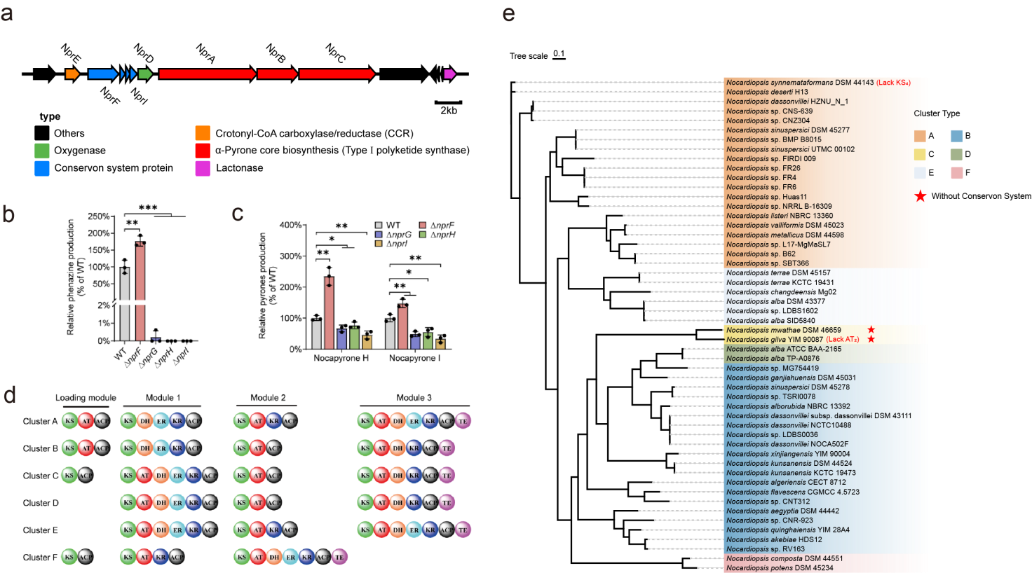 放線菌能夠產(chǎn)生大量具有生物活性的次生代謝物,這些代謝物的生產(chǎn)通常由群體感應(yīng)信號分子調(diào)節(jié)。團隊發(fā)現(xiàn)了擬諾卡氏菌Nocardiopsissp. LDBS0036中的新型信號分子—α-吡喃酮 (α-pyrone),且通過研究驗證了α-吡喃酮的信號分子功能。結(jié)果顯示,小分子nocapyrone I可以介導(dǎo)菌株的群體感應(yīng),誘導(dǎo)吩嗪類抗生素的產(chǎn)生(圖1a-c)。通過生物信息學(xué)分析發(fā)現(xiàn),菌株LDBS0036中吡喃酮合成基因上游存在一個多組分調(diào)控系統(tǒng)——Conservon。敲除該系統(tǒng)的基因后,吩嗪和吡喃酮的產(chǎn)量均受到影響,推測其用于接收和傳遞α-吡喃酮信號(圖2a)。