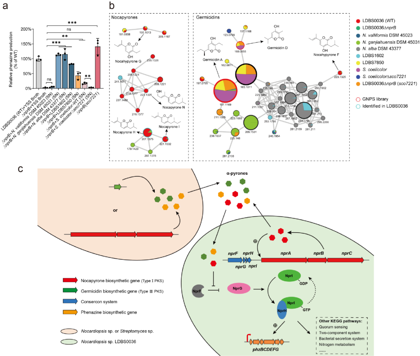 分析發(fā)現(xiàn),包含conservon系統(tǒng)的吡喃酮生物合成基因簇在放線菌擬諾卡氏屬(Nocardiopsis)中廣泛存在并高度保守(圖2e)。此外,吡喃酮同系物在鏈霉菌屬中也存在并且通過不同途徑合成。將代表性的擬諾卡氏菌及鏈霉菌發(fā)酵上清液添加到吡喃酮敲除型菌株?nprB后,恢復(fù)了吩嗪的產(chǎn)生(圖3a)。通過質(zhì)譜分析和構(gòu)建化合物的分子網(wǎng)絡(luò),發(fā)現(xiàn)能激活吩嗪產(chǎn)生的菌株中都可以產(chǎn)生吡喃酮類小分子(圖3b)?;诖?,團隊提出了不同來源、不同類型的α-吡喃酮類小分子介導(dǎo)放線菌種間及種內(nèi)相互作用的模型(圖3c)。該研究結(jié)果拓展了我們對放線菌群體感應(yīng)系統(tǒng)的認(rèn)識,有助于在放線菌中激活沉默的活性代謝產(chǎn)物合成,同時也可以為合成生物學(xué)提供開關(guān)、生物傳感器和邏輯門等工具。
