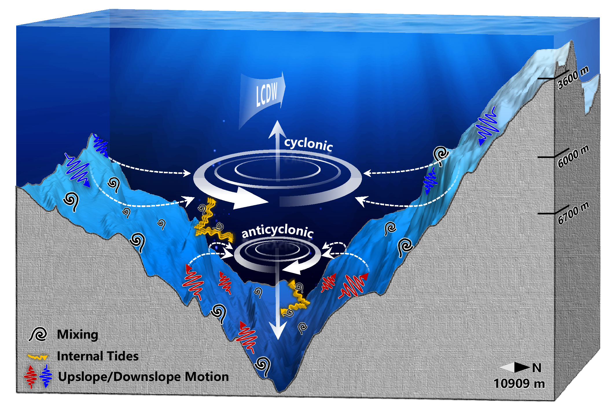 “挑戰(zhàn)者”深淵是世界上最深的深淵海溝。來自南大洋的低層繞極深層水(LCDW)經(jīng)由這一關(guān)鍵樞紐侵入雅浦海溝和菲律賓海盆(圖1),從而對局地環(huán)境產(chǎn)生重要影響。由于極端深度環(huán)境下采樣十分困難,目前仍不清楚“挑戰(zhàn)者”深淵的LCDW輸送和深層環(huán)流結(jié)構(gòu)。為了探究上述科學(xué)問題,研究室聯(lián)合中國海洋大學(xué)深淵研究團隊在“挑戰(zhàn)者”深淵布放了萬米級潛標陣列進行長時間流速觀測(圖2上)。通過分析海流數(shù)據(jù),研究發(fā)現(xiàn)“挑戰(zhàn)者”深淵3600米以深存在三層環(huán)流結(jié)構(gòu),自上而下分別為西向流、氣旋式環(huán)流以及反氣旋式環(huán)流(圖2下)。西向流在夏季轉(zhuǎn)為東向,表明深海盆之間存在雙向連通性,而氣旋式環(huán)流和反氣旋式環(huán)流則相對穩(wěn)定。結(jié)合潛標觀測、數(shù)值試驗和前人發(fā)現(xiàn)的分析結(jié)果表明,該環(huán)流結(jié)構(gòu)是由LCDW入侵、局地特殊地形以及底部強湍流混合共同作用而形成。其中,底部強湍流混合在驅(qū)動反氣旋環(huán)流方面起到關(guān)鍵作用。