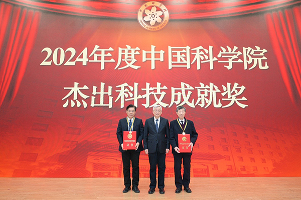 侯建國為獲得2024年度中國科學(xué)院杰出科技成就獎(jiǎng)個(gè)人成就獎(jiǎng)的陳立泉院士、陳仙輝院士頒獎(jiǎng)