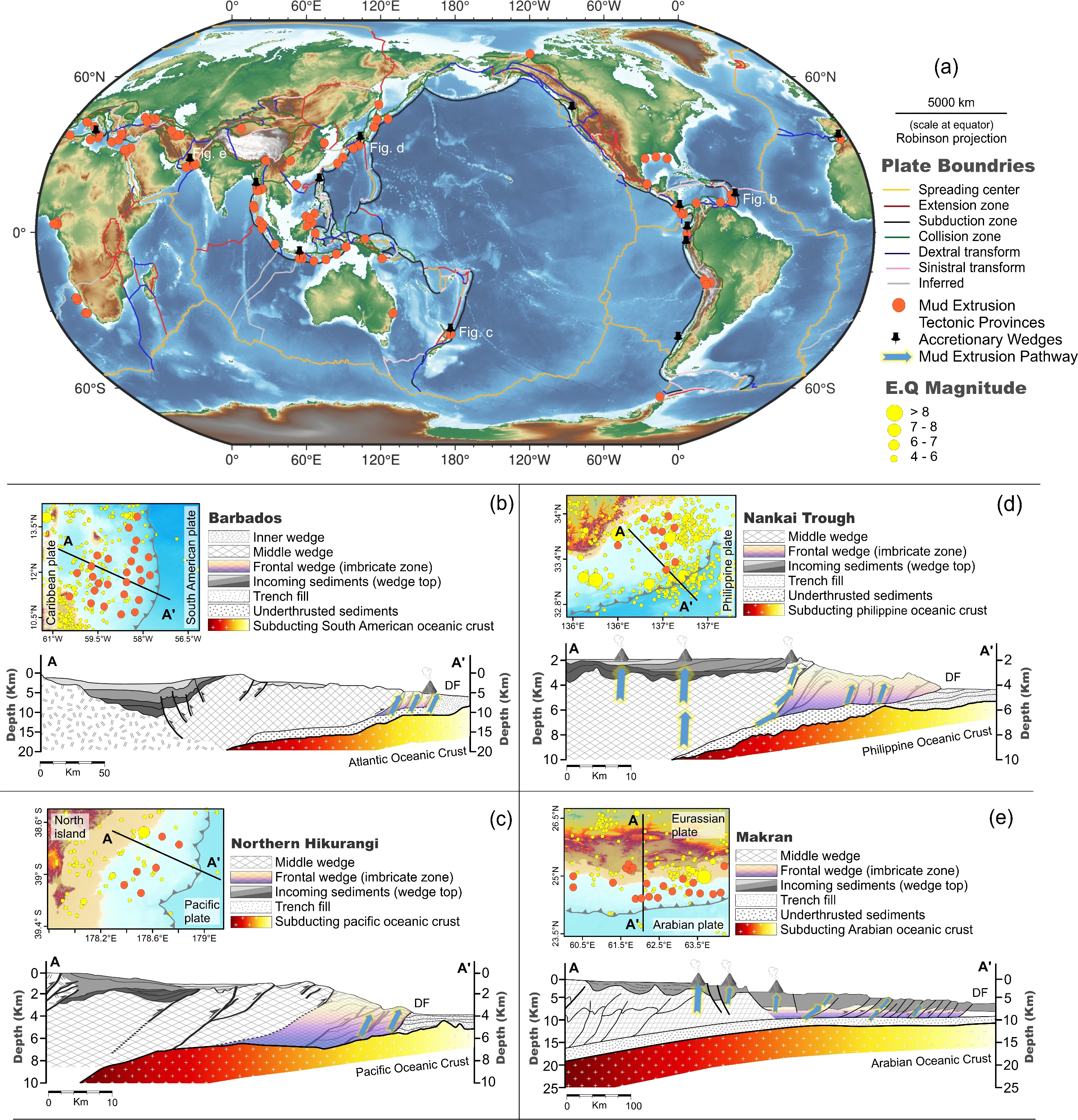 圖2.?(a) 全球富 CH? 泥火山的構造區域;(b-e) Barbados、Northern Hikurangi、Nankai Trough 和 Makran Accretionary Wedges 的示意剖面圖