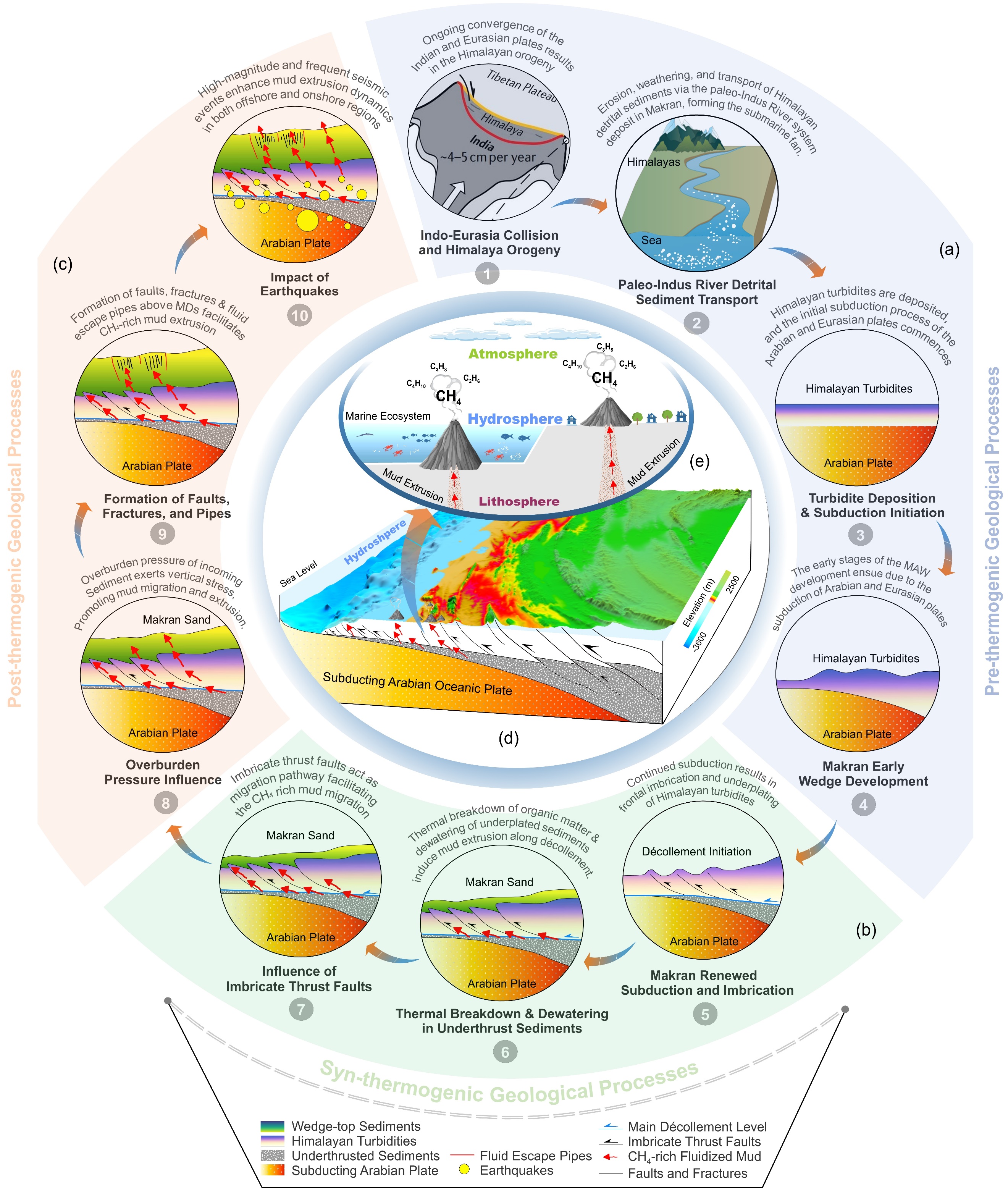 圖1.?俯沖帶中富含CH4的泥火山的地球化學循環、構造驅動因素及環境影響
