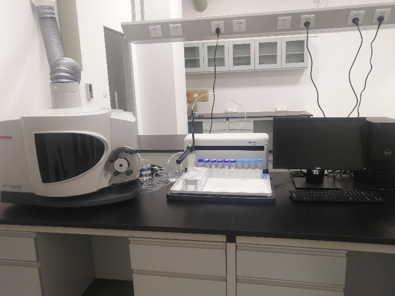ICP-OES 7400位于綜合樓一樓101實驗室,該儀器配置了標準進樣系統、垂直高鹽進樣系統及垂直耐HF進樣系統;具有快速多元素同時分析、靈敏度高、檢出限低、耐基質、線性動態范圍寬等優點。可用于生物、地質、材料、食品、環境等各類樣品中大多數元素的定量分析。