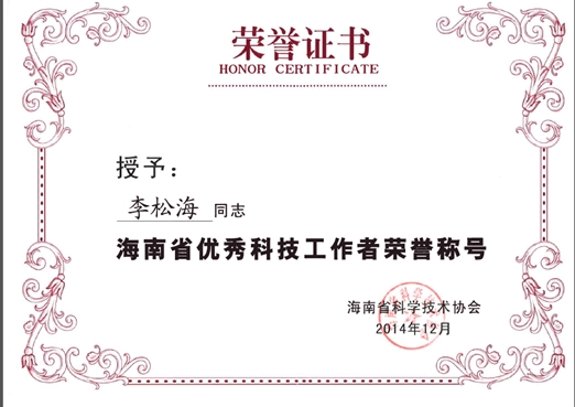 20141218日,中國科協會員日暨第六屆“海南省優秀科技工作者”表彰會在海口召開,三亞深海所李松海研究員被授予“海南省優秀科技工作者”榮譽稱號。