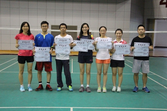 比賽中,各參賽隊(duì)員在球場(chǎng)上積極拼搶、默契配合,將球技發(fā)揮得淋漓盡致,展現(xiàn)了奮勇?tīng)?zhēng)先、頑強(qiáng)拼搏的精神面貌,博得了現(xiàn)場(chǎng)觀眾的陣陣喝彩。裁判員公平公正、盡職盡責(zé)的裁決,保障了比賽的順利進(jìn)行,賽后獲得了運(yùn)動(dòng)員一致贊揚(yáng)。經(jīng)過(guò)幾天的激烈角逐,男單、女單和混雙冠亞季軍相繼產(chǎn)生,賽后進(jìn)行了頒獎(jiǎng)。