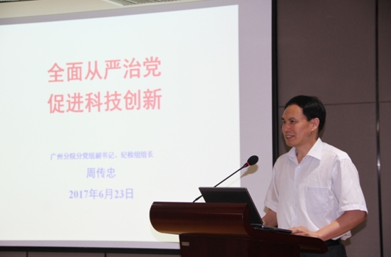 周傳忠以“全面從嚴治黨 促進科技創新”為題,從全面從嚴治黨新形勢新要求、以全面從嚴治黨促進科技創新和當前研究所全面從嚴治黨任務三個方面進行了講解。報告引用了黨和國家領導關于全面從嚴治黨的重要論述和要求,從八項規定、學習教育、反腐敗、選人用人、制度建設、政治巡視、紀監體制改革七個方面闡述了當前全面從嚴治黨的新形勢。報告強調,政治紀律和政治規矩,是國家科研機構發揮戰略科技力量的根本保證。每名科技工作者要旗幟鮮明地講政治,時刻牢記國家戰略科技力量的重要使命,時刻把國家利益、集體利益置于個人利益之上,把講規矩、守紀律與勇于創新、勇于開拓很好地結合起來,不辜負黨、國家和人民的信任與期待。報告指出,當前研究所要深入學習六中全會精神、推進“兩學一做”學習教育常態化制度化、把責任制落到實處、健全完善規章制度、做好監督執紀問責等工作,落實全面從嚴治黨要求。