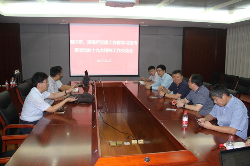1127日,中國科學院海洋研究所所長王凡、黨委書記王輝等一行到訪中國科學院深??茖W與工程研究所,利用活動間隙,兩所召開座談會,就黨建工作暨十九大精神學習宣傳貫徹落實,展開經驗交流。深海所主持黨委工作的副書記代亮,紀委書記謝強參加座談。