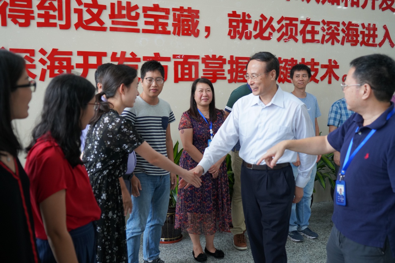 萬立駿一行實地查看了各型深海科考裝備,了解研究所概況和未來發展方向,并觀看海試宣傳片。隨后,在綜合樓大廳接見了該所歸國留學人員代表。