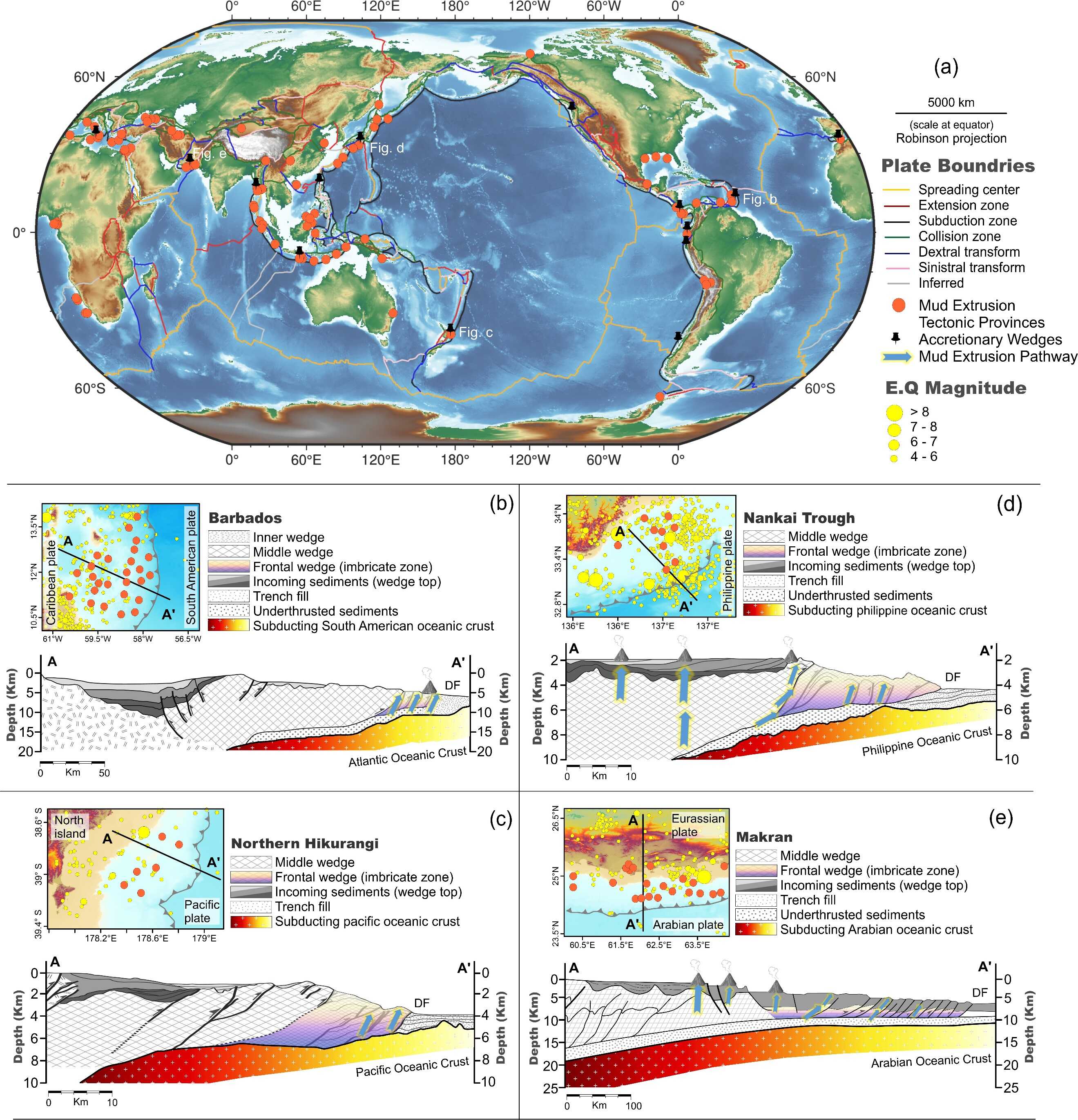 圖2.?(a) 全球富 CH? 泥火山的構造區(qū)域;(b-e) Barbados、Northern Hikurangi、Nankai Trough 和 Makran Accretionary Wedges 的示意剖面圖