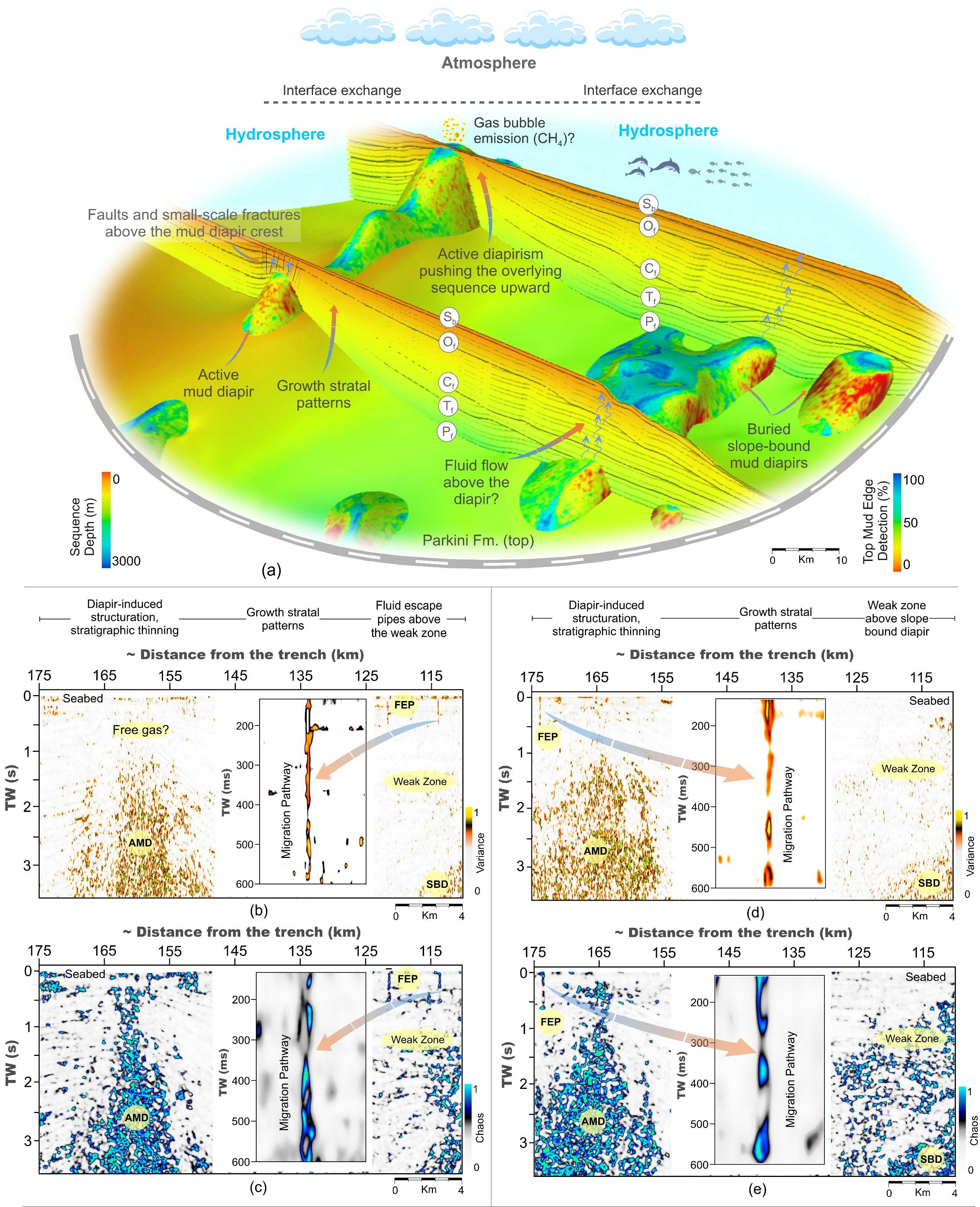 俯沖帶是巖石圈揮發(fā)物流通的關鍵界面,復雜的構造和地球化學相互作用促進了地殼深部儲層中氣體和流體的釋放。泥火山活動作為這些過程的動態(tài)表現(xiàn),貢獻了CH?排放,影響了全球CH?預算并對海洋生態(tài)系統(tǒng)產生影響。全球范圍內,約2000處泥火山位于俯沖帶,突顯了俯沖相關的地球化學和構造過程在促進CH?向大氣和水圈排放中的重要性。 近年來,遙感技術(合成孔徑雷達干涉測量、航空攝影、機載激光掃描)與水聲學方法的協(xié)同應用,系統(tǒng)刻畫了陸域與海域富CH?泥火山的三維幾何形態(tài)與空間分布特征。氣相色譜、同位素分析、原位氣體通量測量以及噴出的泥火山氣體與流化泥漿的地球化學分析進一步推進了對分子組成、同位素特征和再循環(huán)組分化學性質的研究。此外,深海鉆探和搭載CH?傳感器的潛水器為噴發(fā)活動、揮發(fā)性排放及潛在危害提供了新的見解。