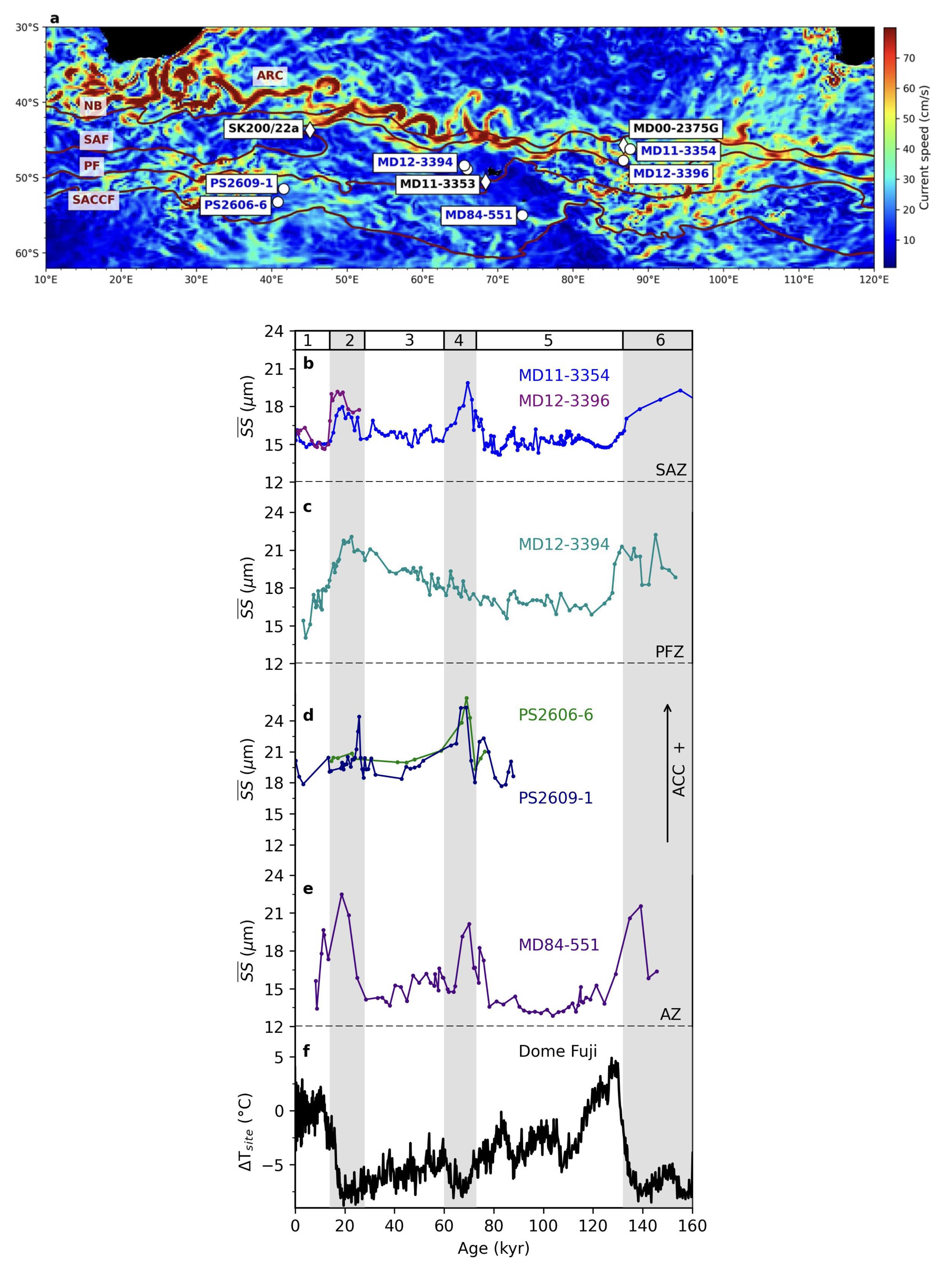 研究團(tuán)隊首先利用南印度洋六根海洋沉積巖芯(橫跨所有主要南大洋鋒面)中可分選粉砂組分平均粒徑